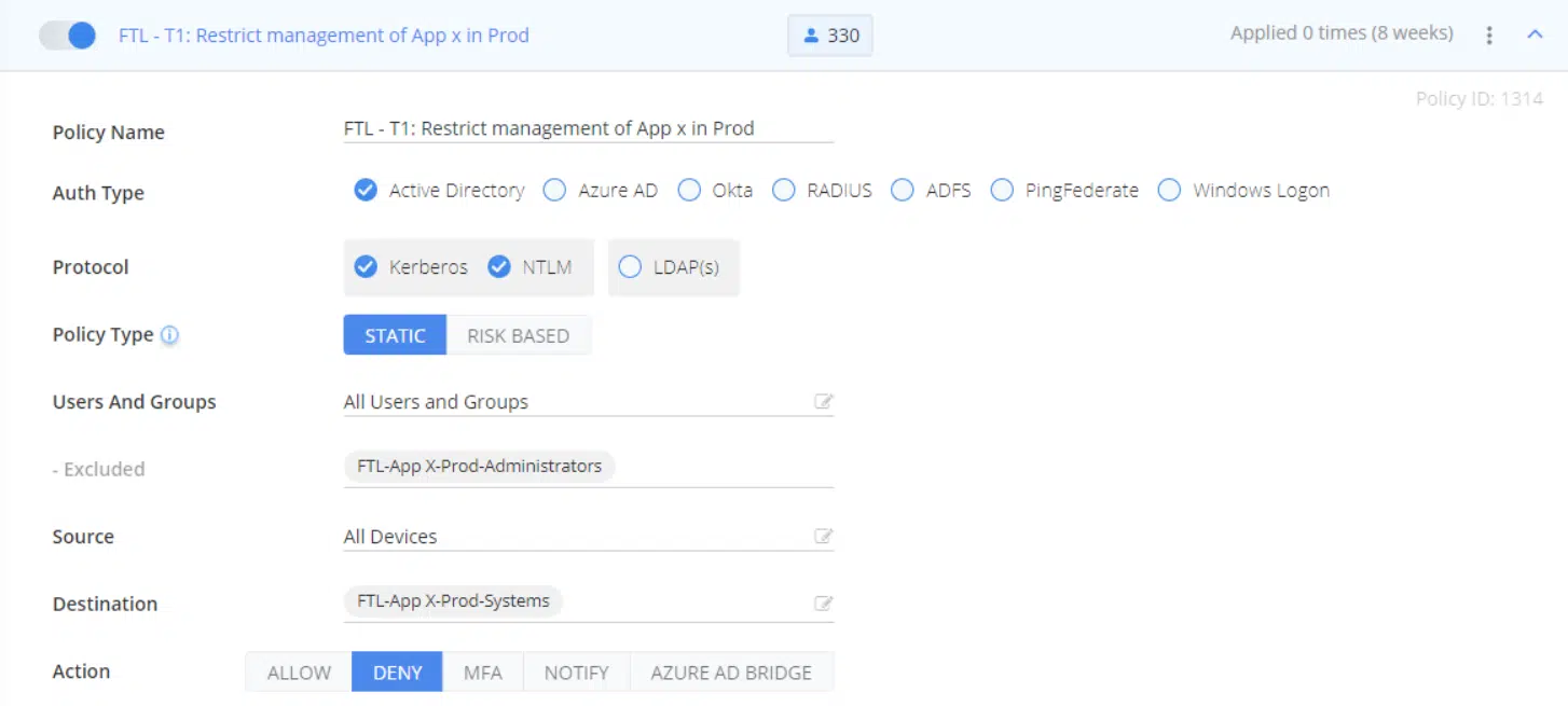 To limit lateral movement / implement least privileges within Tier 1, remote administration of a group of servers « Application X in PROD » can be limited to the group(s) of administrators for the application servers using a DENY policy.