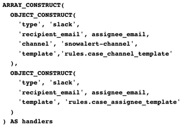In order for the SnowAlert module to know where to send the desired alerts, the view must be defined with a handler that specifies the template for the message sent, the type of channel (e.g. Slack, email), and the target (e.g. email address, Slack channel, Slack direct message).