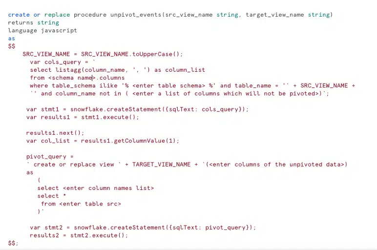 Because dynamic unpivot (over a dynamic set of columns) is not natively supported in SQL, I used Snowflake’s procedure and scheduled tasks to apply this automation. The procedure unpivots a view on the list of alert columns and creates the unpivot view. The scheduled task calls the creation of the procedure for every view needing the unpivot to detect if a new alert has been added. Thus new alerts added are turned into rows automatically.