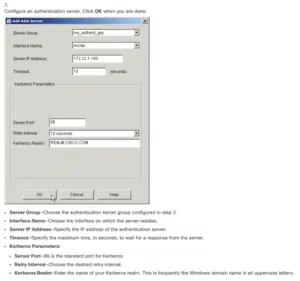 We went back to the configuration guide Cisco. 2007. PIX/ASA : Kerberos Authentication and LDAP Authorization Server Groups for VPN Client Users via ASDM/CLI Configuration Example. 30 July. ; and looked at the parameters required to configure Kerberos authentication:
