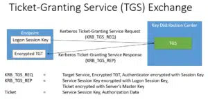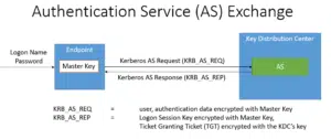 During the AS exchange the user authenticates with the Key Distribution Center (KDC). In return, the user obtains the ticket and key required to authenticate with services in the network without re-entering the credentials. When the user first enters the credentials, the client sends an AS_REQ to the Authentication Service (AS) function of the KDC. The AS_REQ is a message signed by the Master Key, which is a function of the user’s password. The Authentication Service, which is part of the KDC, verifies the AS_REQ according the master key, which is also available to the KDC. After validation the AS_REQ, the KDC returns an AS_REP, which contains a logon session key and a Ticket-Granting Ticket (TGT), that is encrypted with the KDC’s key. The AS Exchange is outlined below. The TGT will be used by the TGS exchange to obtain access to specific services.