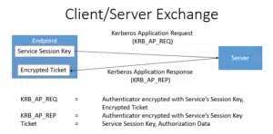 Now the client has everything it needs to authenticate to the service. The client sends an AP_REQ to the service, which is encrypted with the service session key. The service decrypts the service session key to validate the AP_REQ. Then the server returns an AP_REP message and the authentication is complete. The client-server exchange is outlined below: