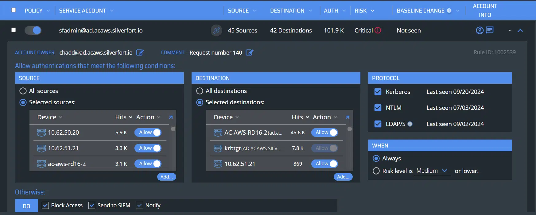 De plus, Silverfort peut mettre en place des contrôles d’accès granulaires sur ces comptes, de manière bien plus simple et chirurgicale que les politiques configurables dans l’Active Directory.