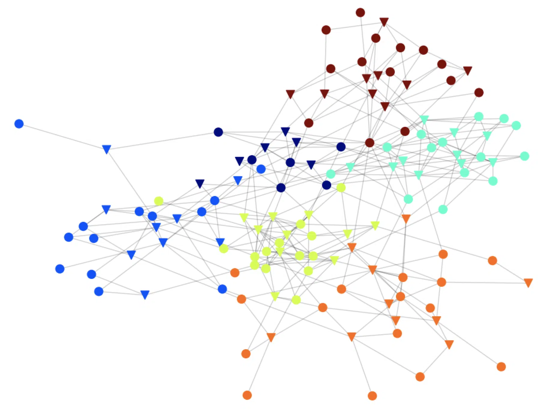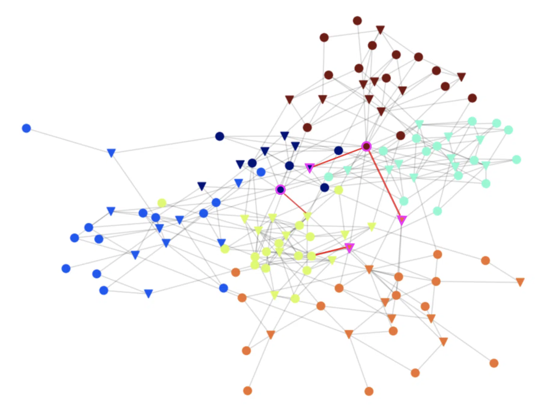 Each circle is a user and each triangle is a server. The weights on the edges are determined by the number of authentication and access requests monitored, and permissions associated with the different nodes (for simplicity, weights are not shown on the graph). Then we use the Louvain algorithm to identify communities in the network. After identifying the communities, the map will look like this: