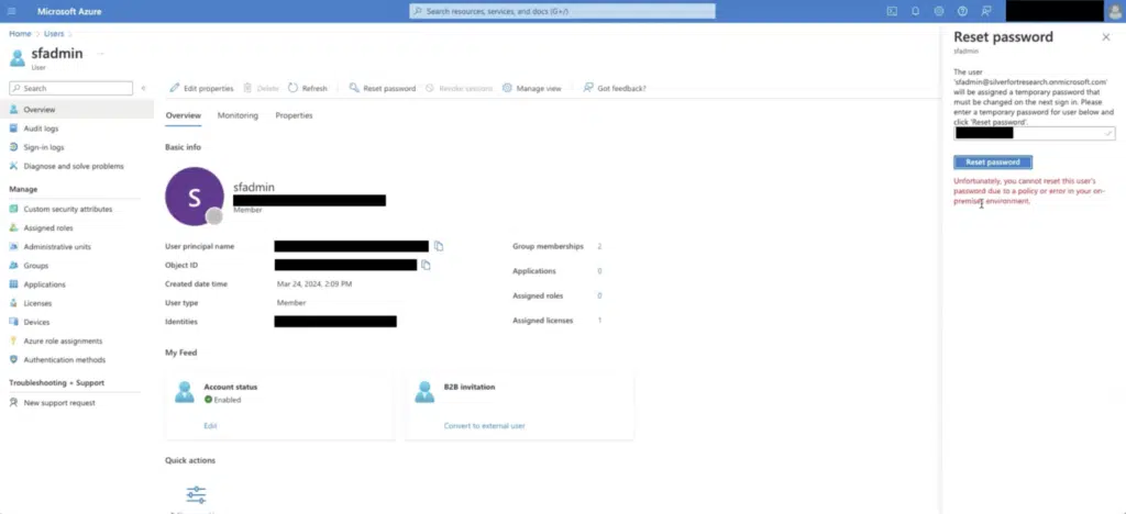 All the attacker needs to do is log in with the right user account, which has at least the Password Administrator role to Entra ID. It doesn’t matter if they use the interface at https://entra.microsoft.com or https://portal.azure.com. Once logged in, they select the target on-premises user and simply reset their password. This allows the attacker to log in to the on-premises environment with the account whose password they changed.