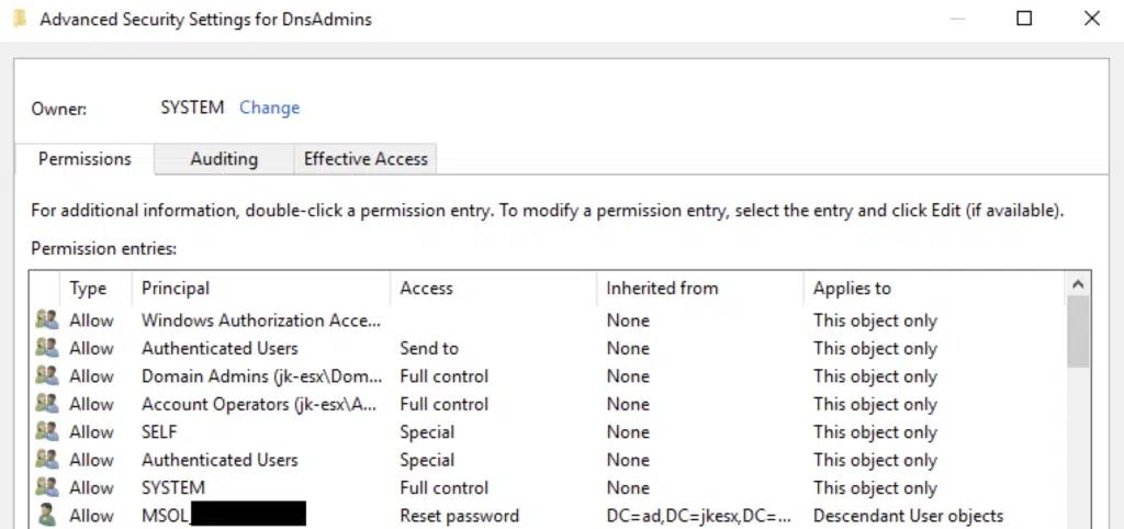 Another example is the DNS Admin group. DNS Admins manage critical network infrastructure components, specifically DNS servers. Since the DNS Admin group is set up as a privileged group without additional protection on-premises, an attacker could easily reset the password of a DNS Admin group member via Entra. This would give them full control over that account in the on-premises environment.