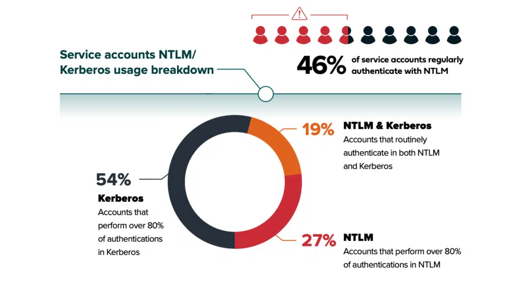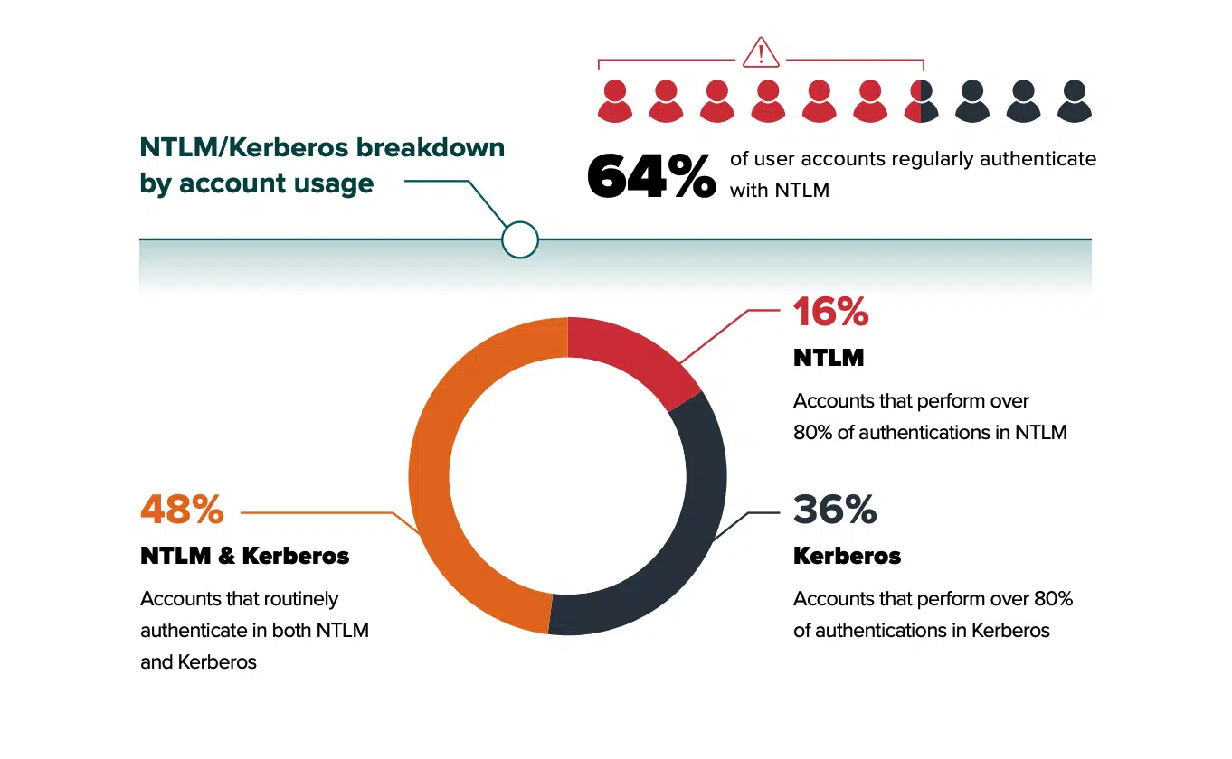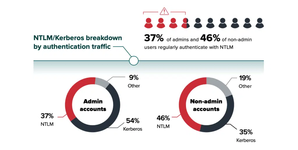 While NTLM being ‘insecure’ is common knowledge, it is still heavily used in production environments. The Identity Underground Report, published in March 2024, disclosed that an alarming proportion of users, admins and service accounts still use NTLM for resource access: