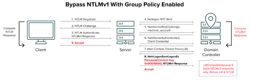 Microsoft’s Group Policy mechanism is designed to disable NTLMv1 authentications. By setting the LMCompatibilityLevel registry key, administrators expect Domain Controllers to reject NTLMv1 traffic and require NTLMv2 or Kerberos instead. On paper, this should eliminate NTLMv1 from Active Directory environments.