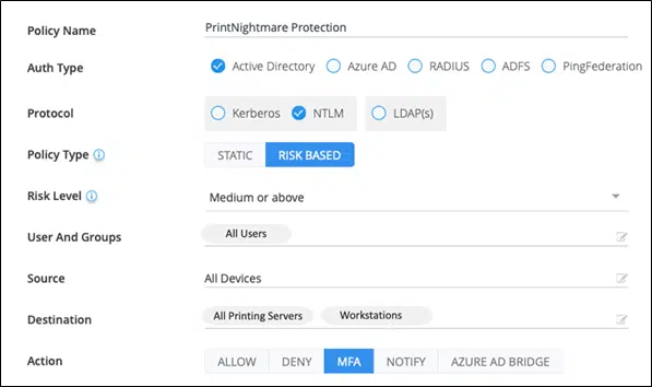 Assign a risk-based access policy that enforces MFA on any NTLM connection to machines where Windows Print spooler service is enabled. After you follow the guidance above, this should be limited to printing servers. Create a policy for any user with risk score ‘Medium’ and above. The published exploits of PrintNightmare use a pass-the-hash attack on NTLM for connections, so this policy would block high-risk access by any attacker attempting to exploit the vulnerability to access target resources.