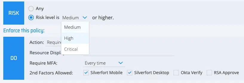 Silverfort can apply static MFA policies that require users to authenticate with a 2nd factor any time they access systems, but that can be quite disruptive. Therefore, risk-based adaptive policies are highly recommended: Adaptive policies can be set to require a 2nd authentication factor only when risk levels are high – this helps minimize disruptions without compromising security.