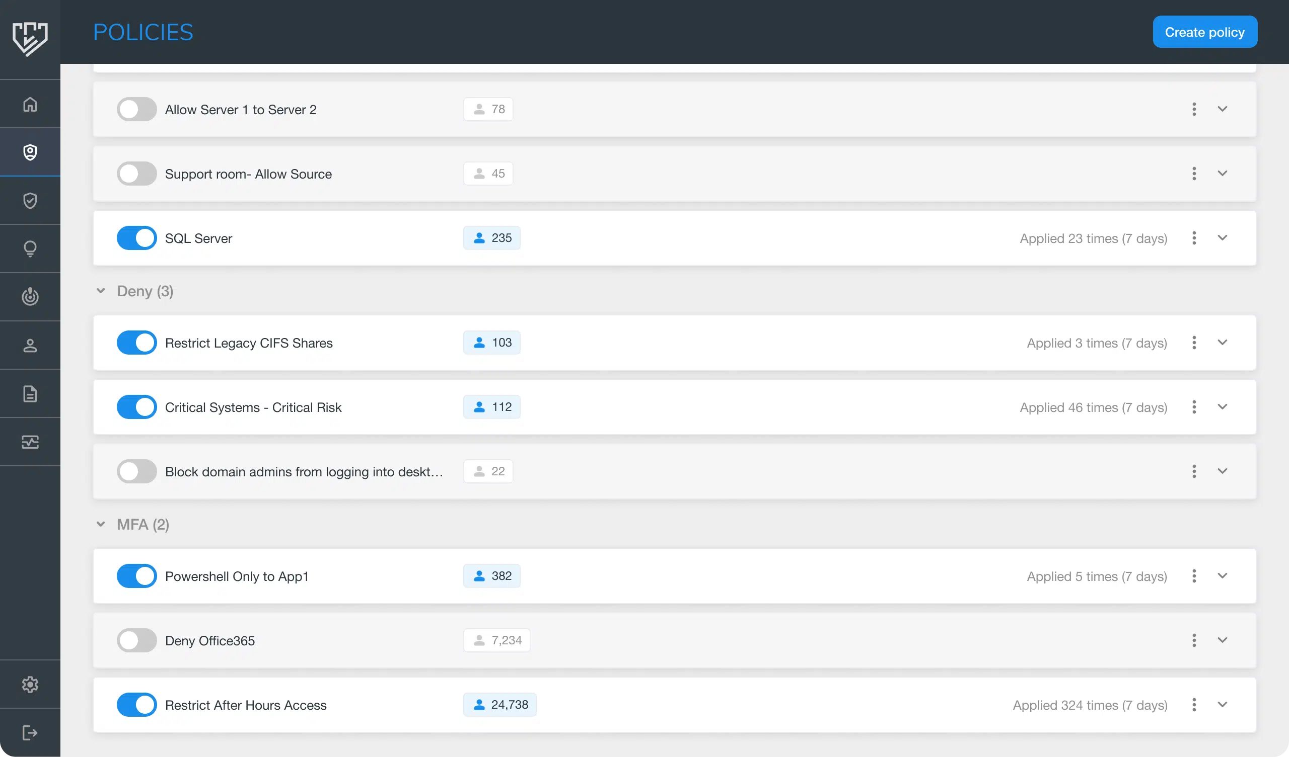 With Silverfort, organizations can configure user access policies in compliance with HIPAA regulations. Access policies are configured based on users, groups, and organizational units (OUs), as well as the least privileges necessary for your systems, processes, and applications. By implementing these policies, organizations can gain full visibility into user accounts, access requests, and authentications, as well as create and monitor log files to detect malicious or irregular activities.