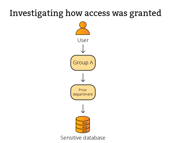 L'équipe d'identité découvre qu'un utilisateur dispose d'un accès administrateur à une base de données sensible. L'examen des appartenances aux groupes ne révèle rien d'alarmant. Mais grâce à des renseignements corrélés, le cheminement complet est révélé :