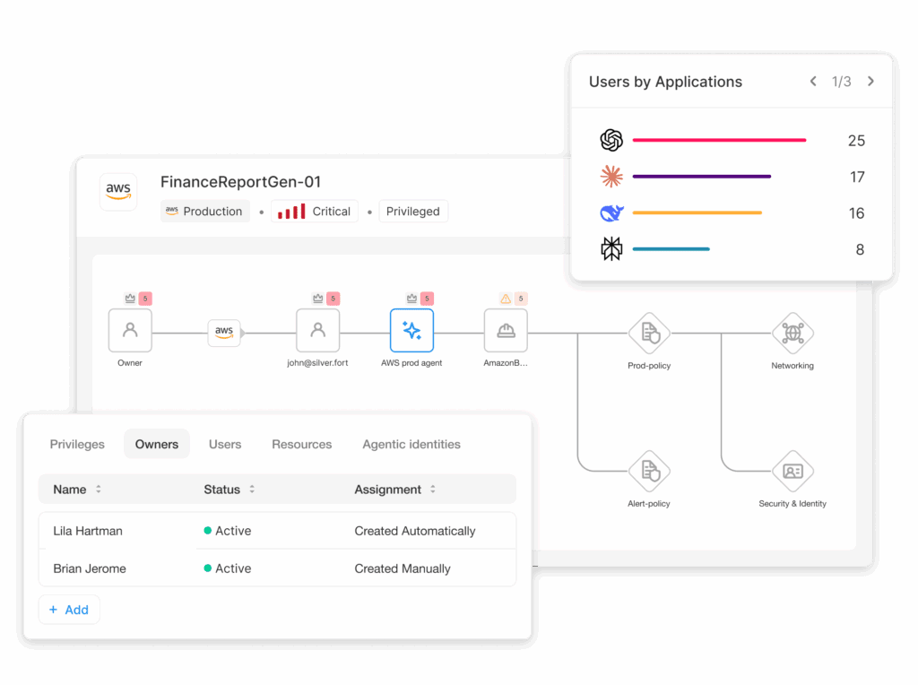 Silverfort maps each agent to its provisioning identity and human owner through visual storyline graphs showing roles, accessed resources, and permission chains.
