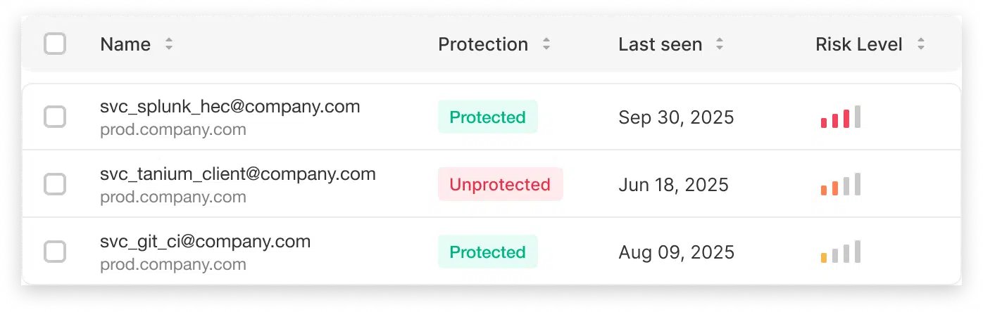 Full NHI control without breaking a thing. Silverfort automatically discovers and secures every service account and NHIβeven unmanaged, unknown, or unvaulted onesβwithout disrupting critical processes or breaking automation.